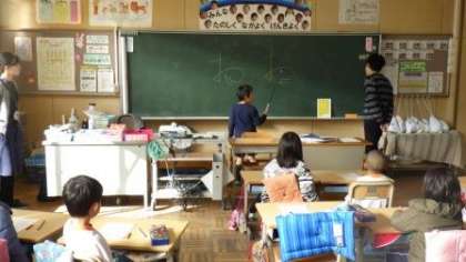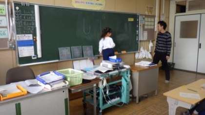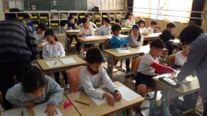 講師の先生による書写指導は今日が2日目。今日は1年生2クラスと2年生1クラスで行いました。低学年は硬筆書写です。先生がお手本にある文字を、黒板に2つ書き、どちらがお手本の文字なのかを子どもたちに考えさせていました。子どもたちは微妙な違いに気づき、線の長さやはらいの方向などをお手本に赤色で書き込んでいました。こうすることで、よりお手本に近い文字になるのですね。見ていて、とても勉強になります。