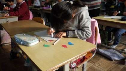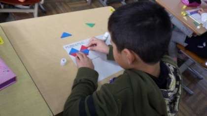 今日の2時間目、2年2組の教室で算数の授業研究会を行いました。子どもたちは、直角三角形を敷き詰める作業を行い、その中から正方形や長方形、大きさの違う直角三角形を見つけ出す活動を進めました。今日はタブレット上で行う活動ではなく、実際に手作業で三角形を敷き詰める活動でした。集中して授業に取り組む様子が見られました。