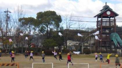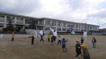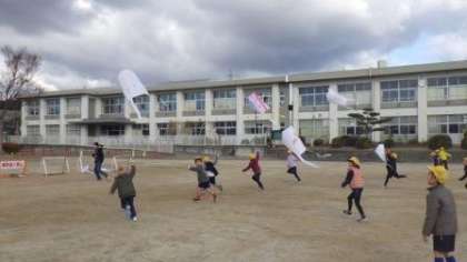 3年生の体育の授業を見ていて、冷え切った身体を温めるために室内に戻ろうとすると、今度は1年2組の子どもたちが運動場に出てきました。図工の時間に作ったお手製の凧(たこ)を、生活科の時間に実際にあげに来ました。ほどよい強さで風が吹いており、子どもたちが作った凧は鉛色の空の下で、子どもに負けないぐらい元気に踊っていました。