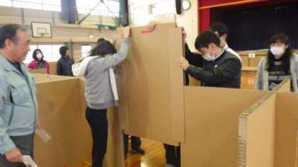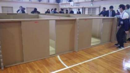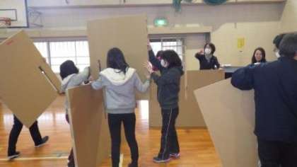 来週の2月14日(木)、4年生が防災学習で、ダンボールを組み立てて避難所を設営する授業を行います。それに先がけて、昨日の児童下校後、体育館で業者の方を講師にお迎えして、避難所設営の実習を行いました。講師の方の指導のもと、先生たちが協力して、およそ30分で1棟6部屋の避難スペースを完成させました。実際にやってみると、想像以上に楽しく、できあがった部屋に入り、まるで子どものように喜んでいる先生たちの姿がありました。