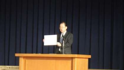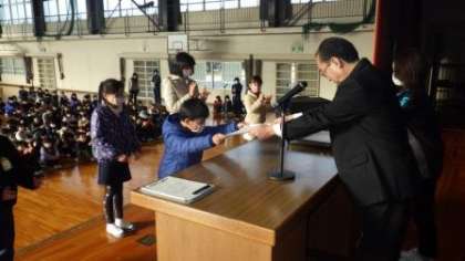 今朝は久しぶりに全校集会を実施しました。インフルエンザの流行は、全国的にまだまだ余談を許さない状況ですので、全員マスク着用で実施しました(舞台へ上がる時のみ、話したり、写真に写ったりする関係で一時的にマスクを外すことはあります)。人権に関する標語や市書き初め大会の表彰などを中心に行いました。校長講話の中では、市交通安全市民会議から交通安全学校表彰(銀賞)を受けたことを子どもたちに紹介し、今後も引き続き、交通安全に気をつけた登下校を呼びかけました。