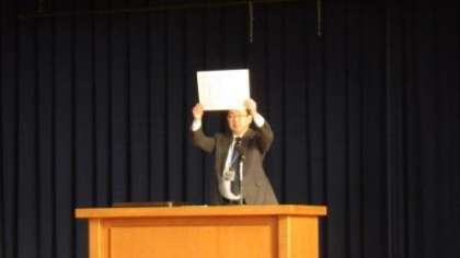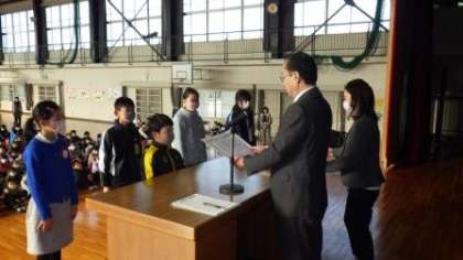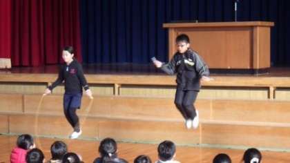 今日は、朝の会の前に体育館で全校集会を行いました。初めに応募作品(読書感想画・調べる学習コンクール)の優秀児童を表彰しました。校長講話の中では、学校外の活動(こども尺八教室)で優秀な成績を収めた児童を紹介しました。校内だけではなく、学校の外部の活動でも頑張っている児童が年々増えています。活動場所への送迎も含め、日々子どもたちを支えてくださっている保護者の皆様のご努力に頭が下がります。集会の最後には、6年生によるなわとびの技の披露がありました。下級生のなわとび練習への良い刺激になったのではないかと思います。