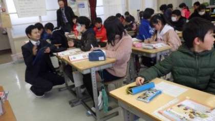 今日の6年生の外国語科(英語)の授業には、保見中学校の英語の先生が見学に来てくれました。子どもたちが、小学校英語から中学校英語へスムーズに移行できるよう研究を進めているそうです。本校の他にも、保見中へ上がる小学校を回り、授業参観を重ねているとのことでした。今日は担任の先生とALTの先生とのティームティーチング授業でしたが、人なつっこい本校の6年生は、中学校の先生にもHELPのサインを出し、教えを受けていました。ちなみに、カメラを持って、写真を撮っていた私にも「校長先生!HELP!」と助けを求める子もいました。