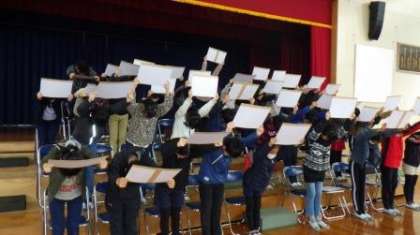 3月に入り、20日(水)の卒業式に向けて、6年生練習は始まっています。今日も体育館で練習が行われていました。6年生は卒業式の主役らしく、背筋を伸ばし、担任の先生の説明を聞いていました。写真は、卒業証書を受け取り、お辞儀をする練習の様子です。実際は、ひな壇で全員が一斉にこのような動きをすることはありません。演台の前での動きを、一斉に練習しました。