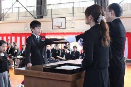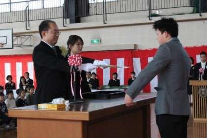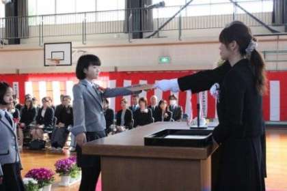 卒業証書授与の様子です。担任の呼名に、精一杯の返事をして応えていました。「おめでとう」と声をかけると、「ありがとうございます」と小さな声で返事をしてくれる子もたくさんいました。