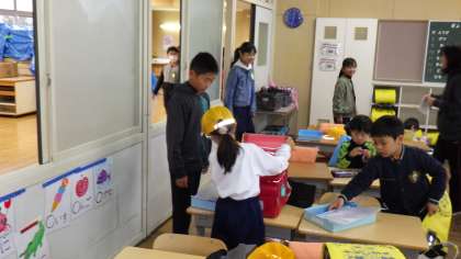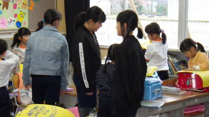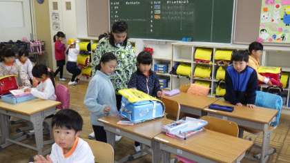 朝、1年生が登校すると、6年生が1年生教室で待っていて、荷物の整理などいろいろなお世話をしてくれています。1年生が安心して生活できるのは、6年生のおかげです。