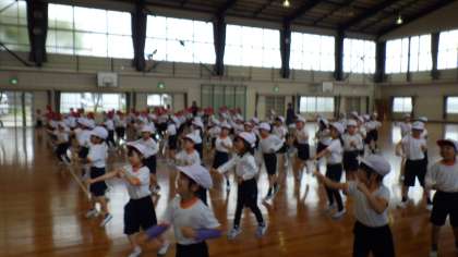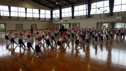 本日もグラウンドコンディション不良のため、体育館で練習です。1.2年生の演技は、「ヤングマン」の曲にのせて踊ります。ノリノリで練習をする様子がとても微笑ましいです。
