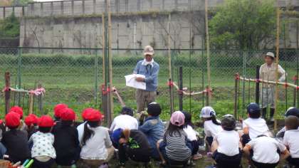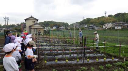 野菜名人に準備していただいた菜園で、1,2年生が、夏野菜(なす、ピーマン、ミニトマト、きゅうり)を植えました。名人から植え方を聞いて、上手に植えることができました。しっかりお世話をして、いっぱい収穫できるといいですね。
