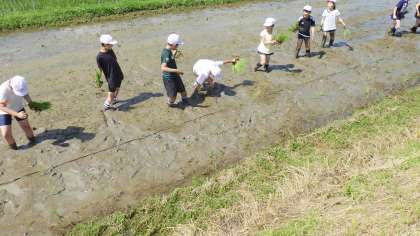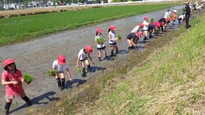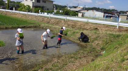 5年生では、米作り体験学習をしています。「はっぴー農産」にお世話になりながら、田植えと稲刈りを体験します。梅雨の晴れ間に5年生全員で横一列に並び田植えをしました。