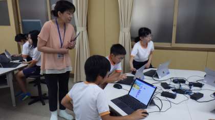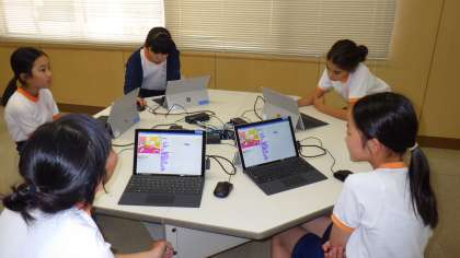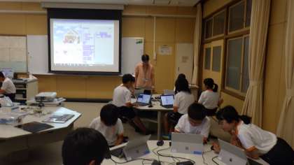 本校には、ICT支援員の山下先生が月に1〜2回来校して、全学年を対象にタブレットなどのICT機器を使った授業をしています。プログラミングや情報モラル、エクセルの使い方など分かりやすく教えていただいています。写真は、5年生図工の授業でCPに命令を打ち込んでキャラクターを動かす授業です。