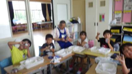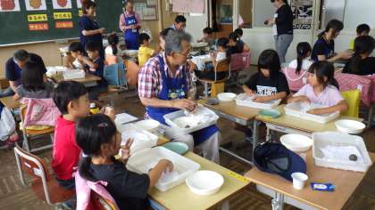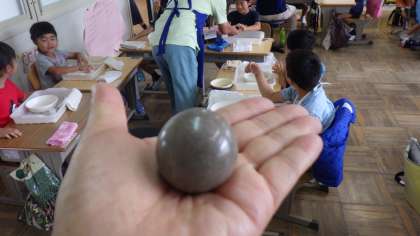使用する土は、陶土です。やさしく、ていねいに、根気づよく、丸めていくのがこつです。子どもたちは、黙々と作業を進めていました。ものづくりの町、豊田市ならではの活動です。見本のように光るまでできるといいですね。