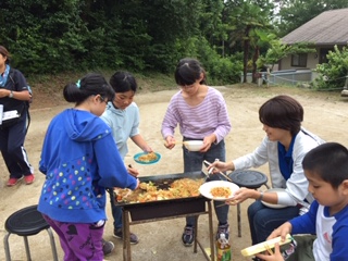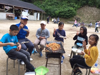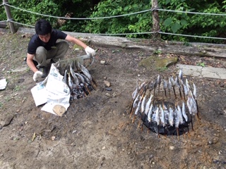 2日目の夕食は、焼きそばと鮎の塩焼きです。キャンプで4回目の野外炊飯ともなるとだんだん手際が良くなります。このあとは、キャンプファイヤーです。