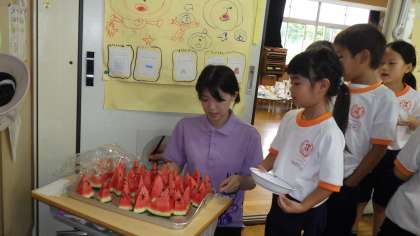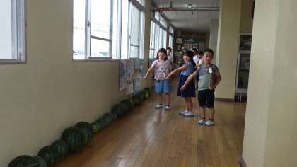 学校の菜園で野菜名人さんがスイカを育てていただきました。収穫できたので、給食の時間に全校児童でいただきました。あまくて美味しかったです。ごちそうさまでした。