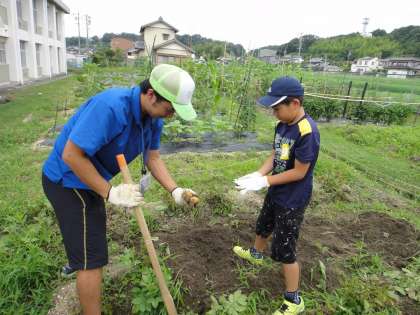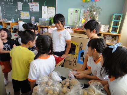 菜園で育てて収穫したじゃがいもを7組の子たちが、先生たちに一袋50円というお値打ち価格で販売をしてくれました。販売を4年生の子たちも手伝ってくれました。