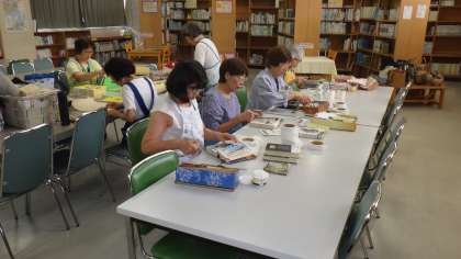 豊田市中央図書館から「学校図書館蔵書の修理ボランティア」を派遣していただき、本校の図書館の本を修復していただきました。市内の各校を巡回して活動していただいています。手際よく、次々と本が修復していきました。ありがとうございました。