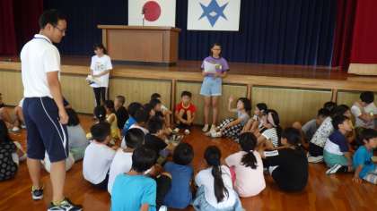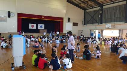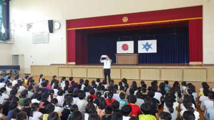 夏休み明けの全校集会では、校長から「大きな事故やけがもなく、無事に夏休みを過ごすことができました。これが何よりうれしいことです」と話がありました。その後、生徒指導担当より、「元気にあいさつ、明るい笑顔」という生活目標の話がありました。また、ミニ通学団会を行い、通学団で頑張っていることを発表し合いました。