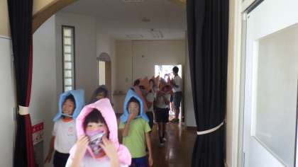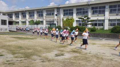 今回の避難訓練は、家庭科室で火災が発生した想定で運動場へ避難をしました。暑い中でしたが、とても静かで速やかに避難できました。閉じた防火扉をくぐる体験も行いました。京都で痛ましい火災事件の報道からも火災に対する備えが必要だと感じました。