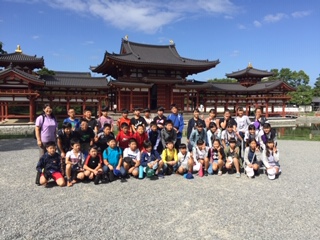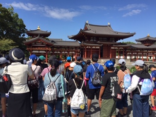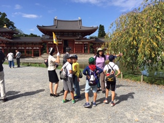 最初の見学地は、平等院でした。京都に来たなあと実感します。10円玉と比べて、おー!と声が上がりました。