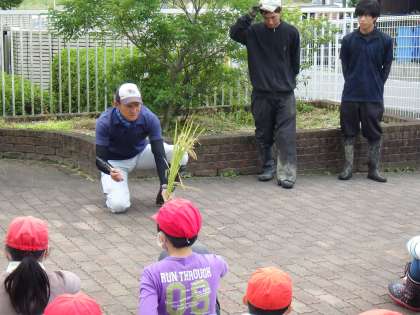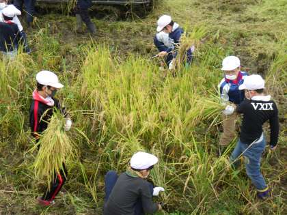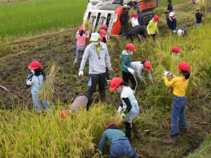 5年生が、稲刈りを体験しました。6月に植えた苗も、猛暑や台風にも耐えてたわわに実りました。「はっぴー農産」さんのお力を借りて、鎌で稲を刈り取り、コンバインで脱穀しました。雨の影響で下がぬかるんでいましたが、力を合わせて収穫しました。