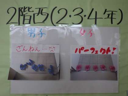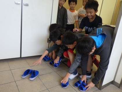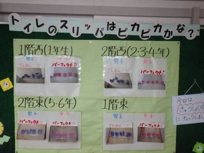 現在、養護教諭の先生がトイレのスリッパの整とんを呼びかけています。保健室前の掲示板にスリッパの整とん状況の写真を毎日更新して、注意喚起をしています。日に日に整とん状況は良くなっているとのことです。通りがかりにスリッパの整とんを子どもたちにお願いしたところ快くやってくれました。