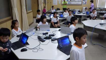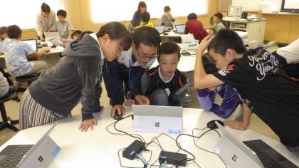 以前にもお伝えしましたが、本校にはICT支援員が月に1、2回来校し、担任とともにICTの支援授業を行っています。本日は、4年1組と5年2組ではスクラッチというプログラミングソフトでキャラクターを動かす命令を入力しました。1ねん1組では、お絵描きソフトでハロウィンのカードを作りました。結構、慣れたもので上手く操作する子が増えてきました。