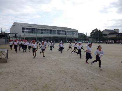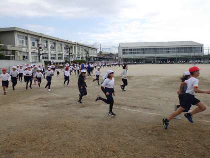 本日より、12月5日までの14日間の持久走練習を開始しました。準備運動をしっかりした後、自分のペースで音楽に合わせて運動場を周回します。児童の励みや目標となるように100周したら達成賞を渡します。中には、昼休みに自主的に練習をする子もいます。