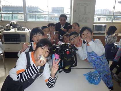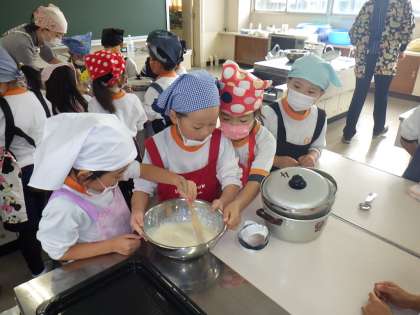1年生は、生活科「あきとなかよし」の単元で自分たちで収穫したさつまいもをカップケーキにして食べました。おっかなびっくりではじめて包丁を使う子や協力してホットケーキの粉を混ぜる様子がかわいかったです。できたカップケーキは日頃お世話になっている6年生におすそ分けしました。