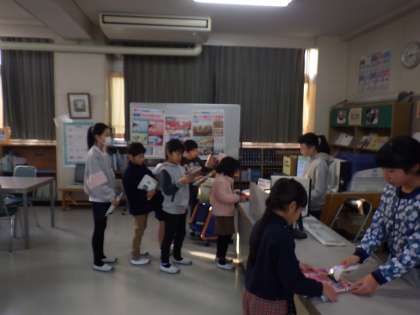 今週、図書委員会では「サンタクロース図書館祭り」と題して、本に親しむ機会を作っています。図書館クイズや手作りの塗り絵を用意し、好評を得ています。毎朝、図書室は貸出の列を作っています。