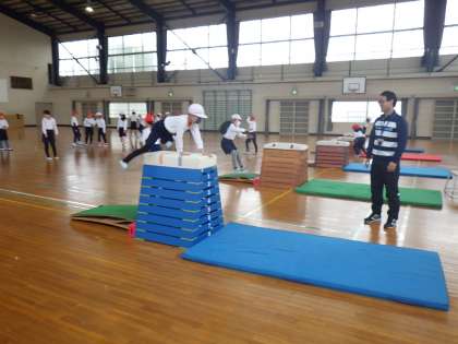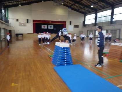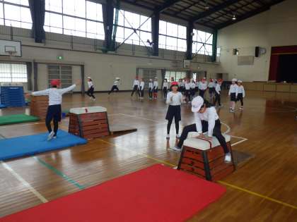 4年生の体育は、タグラグビーの予定でしたが、雨でしたので体育館で跳び箱の練習をしたました。それぞれ自分にあった高さに挑戦しています。いつも元気な4年生。体育が大好きです。