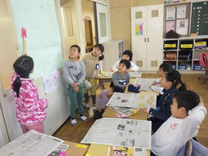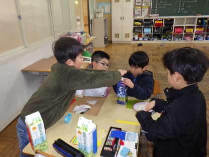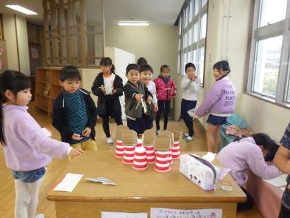 2年生の生活科では、1年生を招いて「おもちゃ作り教室」をしました。新聞紙けん玉や魚つりゲーム、輪ゴム鉄砲など1年生の子たちが喜びそうなものを用意しました。作ったおもちゃで楽しく遊ぶことができました。