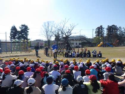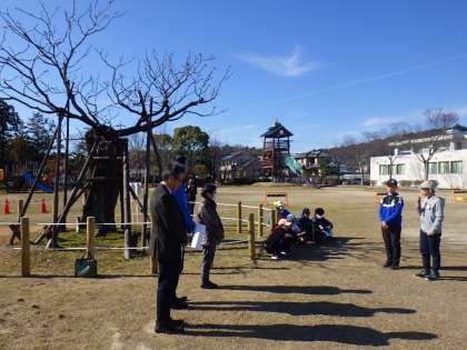 トヨタ生協植栽事業で新しくしていただいたセンダンの木の囲い柵のお礼にトヨタ生協様と樹木医の豊田ガーデン様をお招きして「センダンの木を守ろう会」を行いました。センダンの木の周りで全校児童で校歌を歌い、センダンの木を守ることを誓いました。