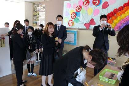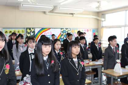 本日は、38名の卒業生が全員そろって無事卒業式を行うことができました。ぶっつけ本番ですが、朝、教室にあつまって短い時間で簡単に式の練習をしました。