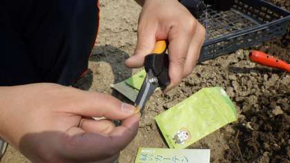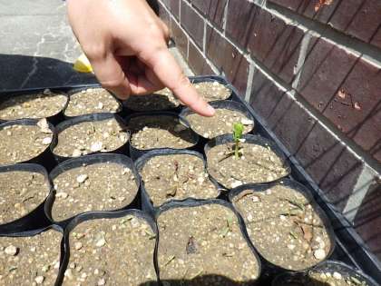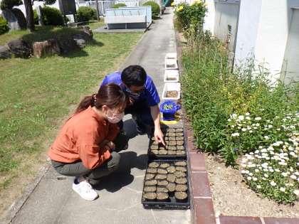 4年生では、理科でツルレイシ(ゴーヤ)を育てます。5月1日に植えた種が発芽しています。子どもたちが来るまで枯れないようにしっかり水やりしますね。