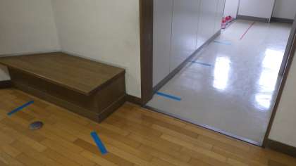 そこで、順番を待つ場所に目印のテープを貼り、密集を防いでいこうと思います。