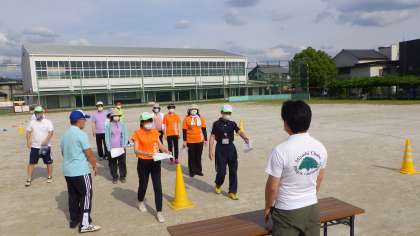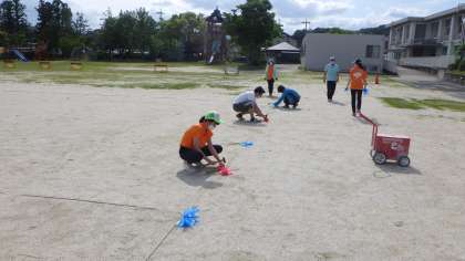 そして、下校についてです。下校時に運動場に整列する際、ソーシャルディスタンスを確保できるように、通学団ごとの集合場所に目印をつけました。ソーシャルディスタンスを意識していきましょう。