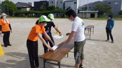 まず、登校時です。教室に入る前に、健康観察カードをチェックし、手洗いをする動きが、スムーズにできるようにシミュレーションを行いました。子どもたちが、教室の中に入るまでのルールが身につくまで、運動場で健康観察カードのチェックを行う予定です。ご家庭での検温、健康観察カードの記入をよろしくお願いします。