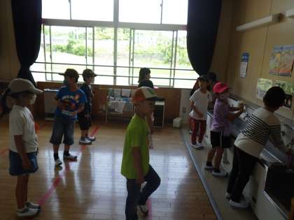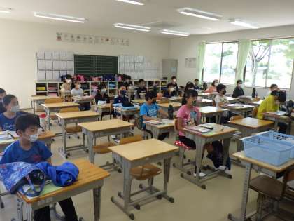 教室では、できるだけ机の間を離して座りますが、スペースに限りがあるので、人数の多い5年生は大変です。