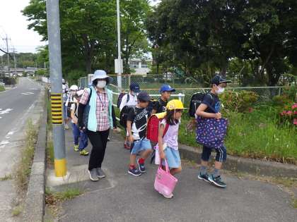 ・下校は、通学団担当の教員が引率しました。明日からは、給水ポイントに立って様子を見守る予定です。