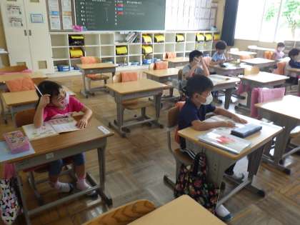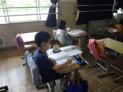 登校が始まって1週間がたちました。分散登校は今週いっぱい続きますが、子どもたちははとても落ち着いた学校生活を送っています。授業もしっかり受けています。今日は各学年の授業風景をお送りします。上から1年生、2年生、3年生です。