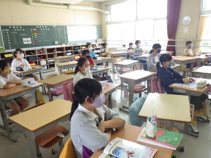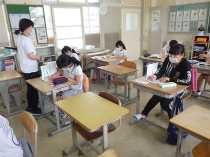 5、6年生は、水〜金の朝のSSタイム(15分間)の帯時間で、今年度より本格導入された外国語科の授業を行っています。15分間なので、短時間で集中して取り組めるというメリットがあります。写真は、6年生の様子です。