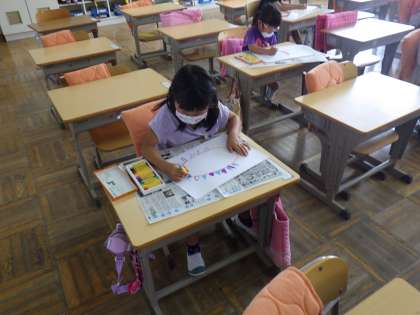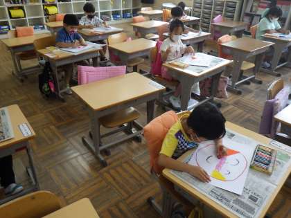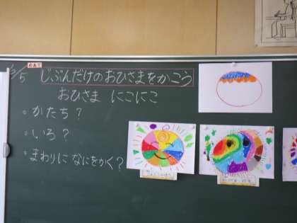 1年生の図工では「じぶんだけのおひさまをかこう」という題で画用紙いっぱいに思い思いのおひさまの絵を描きました。1年生らしい迷いのないすてきなおひさまができました。