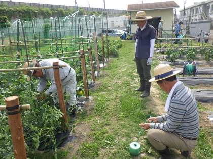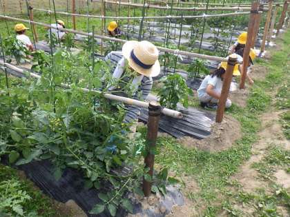野菜名人さんたちが、6月22日に予定されている「いものなえさし」の準備にきてくれました。その間、1・2年生の子たちが草取りや観察にきて、ご挨拶しました。「おはようございます。ありがとうございます。」