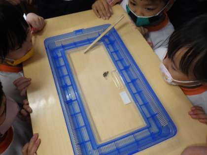 見てみると、今、まさにモンシロチョウが羽化する瞬間でした。「がんばれー」と声をかけている姿が良かったです。