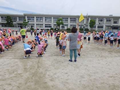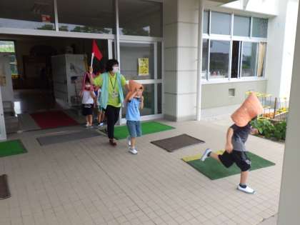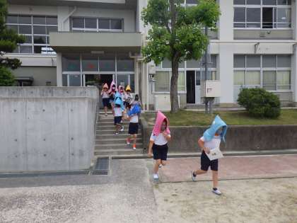本番では、全員が防災ずきんをかぶり、「押さない、走らない、もどらない」の「お・は・し・も」の約束を守って、順序良く避難することができました。今回は、基本の避難でしたので、次回は想定やねらいを変えて、訓練する予定です。