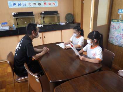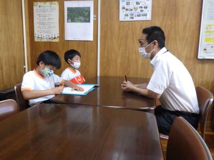 記事をつくるために1組と2組の子がそれぞれ、校長室にインタビューにやってきました。