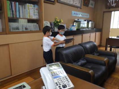 先日は、校長室で4年生の取材を受けましたが、今日は、1年生の子たちが取材にやってきました。