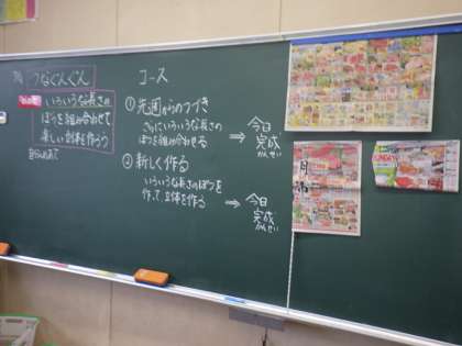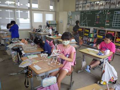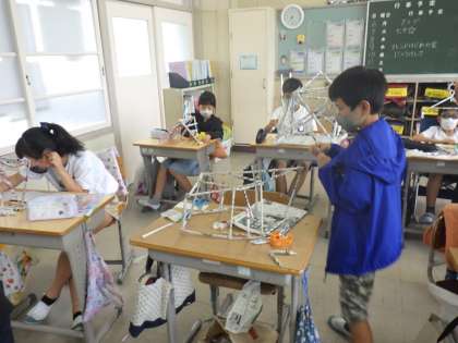 4年生では、図工「つなぐんぐん」で新聞紙や広告などを棒状にして、楽しい立体模型を作りました。