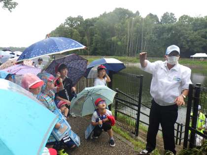 源氏ホタルの幼虫の人工飼育の様子を見せてもらい、えさとなるカワニナの飼育状況や幼虫の放流地である唐池周辺の見学をしました。