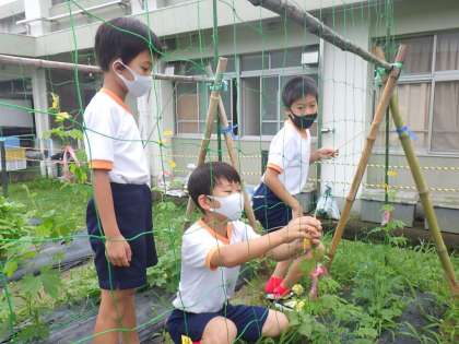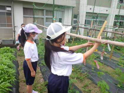 4年生の理科で育てているツルレイシ(ゴーヤ)もぐんぐん生長中です。