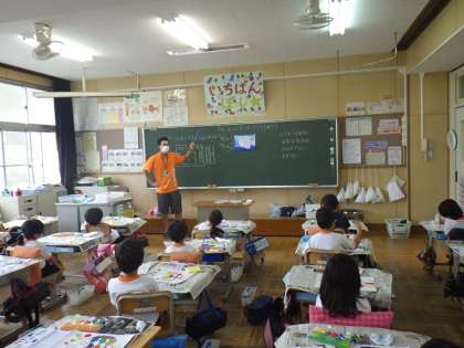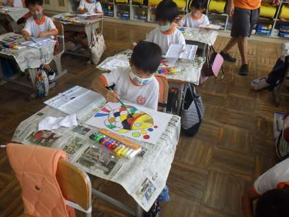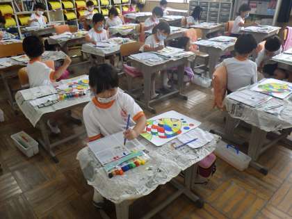 1年生の図工では、初めての絵の具で色をぬる練習をしています。